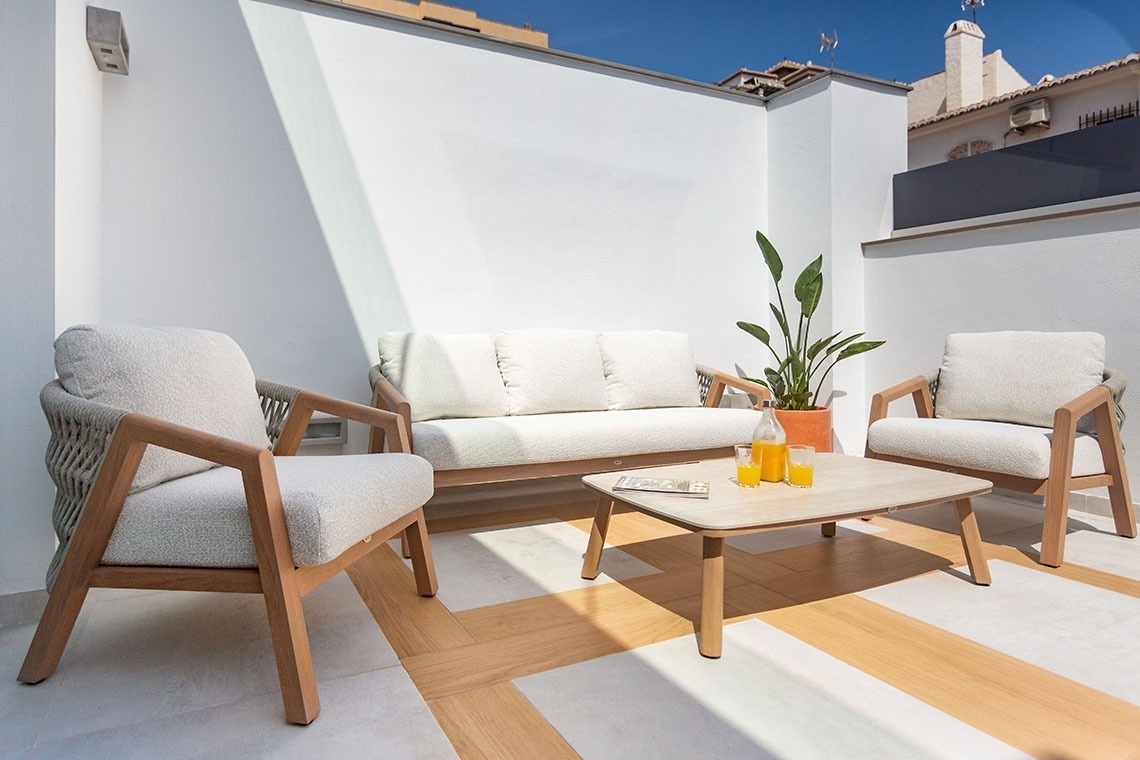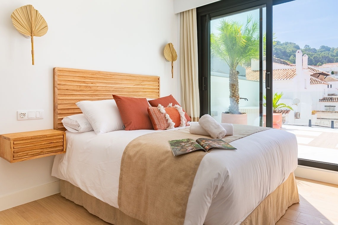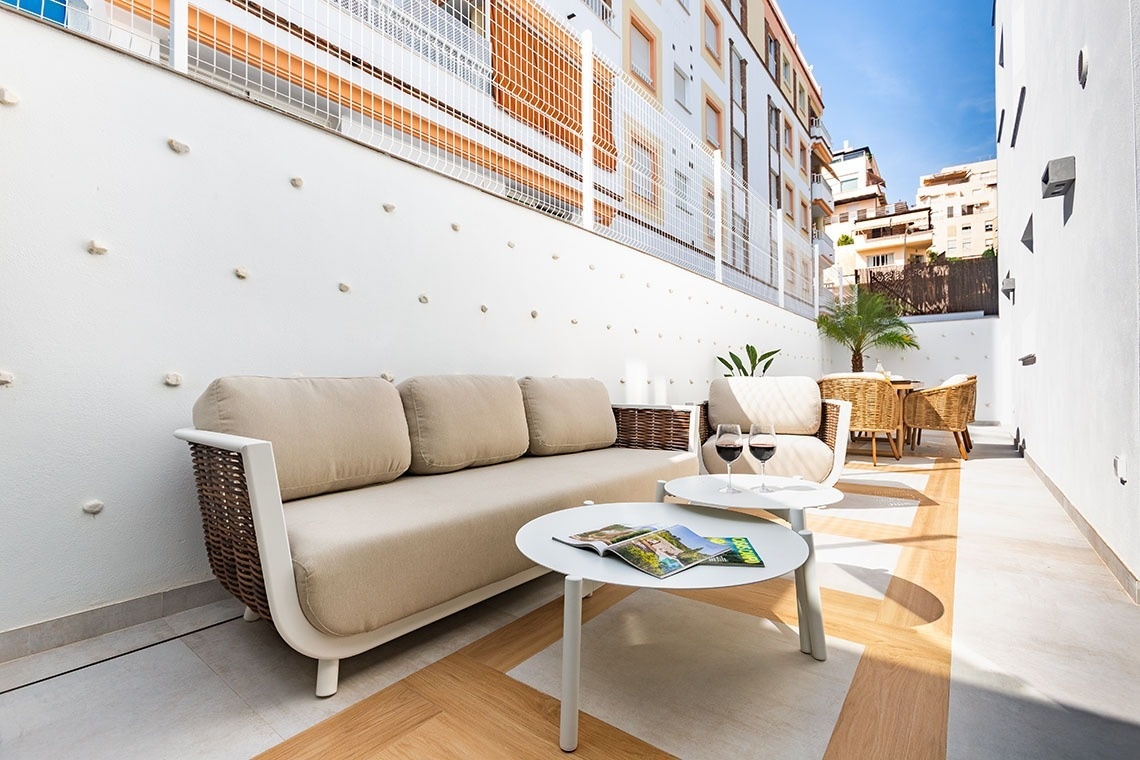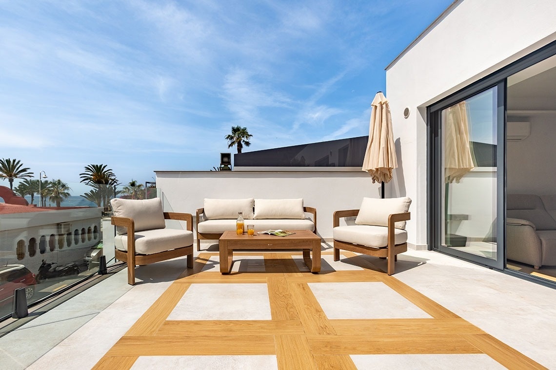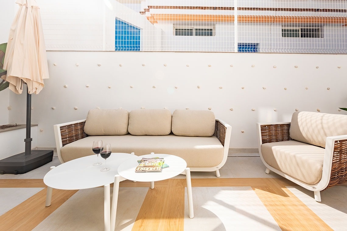 Its greatest treasure is the terrace: an intimate space where you can feel the sea breeze, have breakfast to the sound of the waves, or toast the sunset with the Mediterranean in the background.
